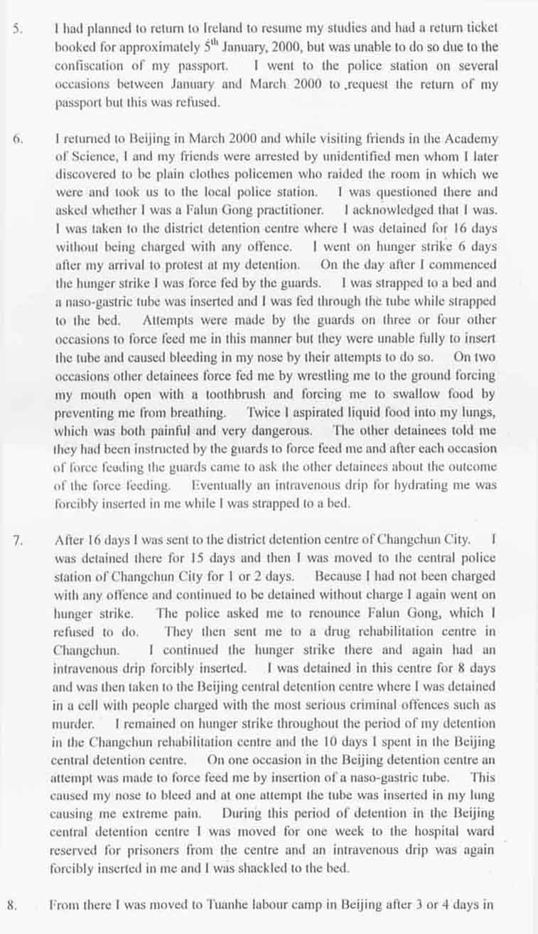 Ho, Tse, Wai and Partners律师事务所John Clancey律师要求我去香港为案号为WSC548,2002的刑事诉讼案中的被告作证,因为我曾经在中华人民共和国未经审判而被拘留和监禁过,原因是我修炼法轮功,并向那里的当局抗议它对其他修炼者的监禁和虐待。我无法前往香港,因为我没有(被中领馆允许申请)签证。因此, 我为上述诉讼案中的被告送上这份宣誓过的证词,以供使用。