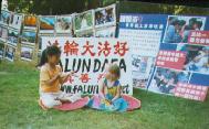 我们把香港警方诬告法轮功学员的事实真相照片放在醒目位置,还有许多的正面宣扬大法的美好画面,桌面上摆放了多种多样的大法资料及学员自己制作的带有纸荷花的感谢卡。学员们在展台旁边绿草如茵的草地上一遍又一遍地炼着五套功法,给人们一种平静、祥和、优美的感受。