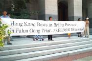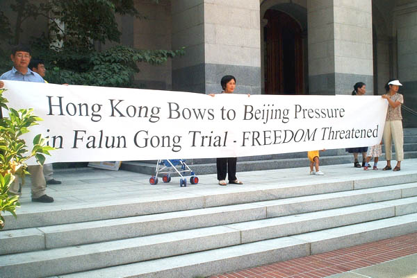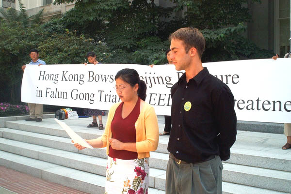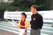 【明慧网2002年8月17日】今天(8月15日)中午在加州州政府议会大厦前,法轮功学员就十六名瑞士及香港法轮功学员被错误判决一事举行新闻发布会。法轮功学员表示,法庭的判决完全颠倒是非,法庭是在不公正的基础上审理这宗案件的,这是一场政治审讯。十六名法轮功学员在中央驻港联络办事处(简称中联办)门外合法地和平请愿静坐,却被诬告继而定罪,又一次证明江泽民对法轮功的迫害已延伸至香港,已严重损害香港的「一国两制」政策和未来发展。