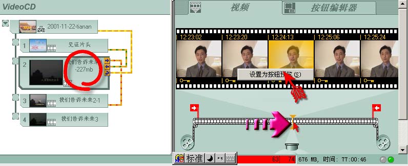 在Video CD中选中要更改按钮图片的影视素材,再从右侧“视频”栏中搜索满意的帧,找到后点击该帧,使之变成黄色,再点鼠标右键,会弹出一个菜单:“设置为按钮预览”,用左键点击确认即可。
