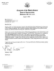 - 美国北卡国会议员麦尔文.瓦特就法轮功学员受骚扰事件的回信