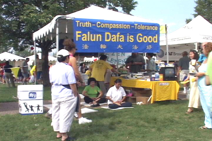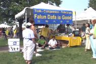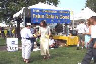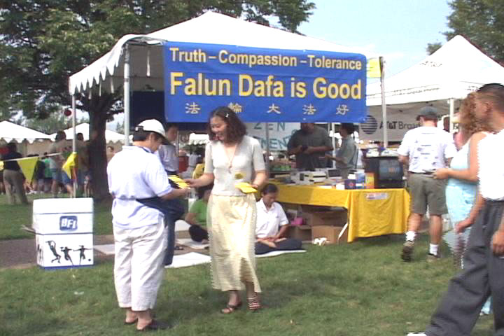 大家顶着烈日在展棚外向过往游客发送大法宣传资料,并向人们耐心地讲述着法轮大法和大法弟子在中国国内遭受迫害的真相。远处不时地传来观看龙舟比赛的欢笑声和龙舟节舞台演出时的阵阵掌声。可是,大家的心一点也没有被其所动,每个人都在专心致志地做着洪法的事。因为大家心里都十分清楚自己所肩负的历史责任的重大。经过我们大家的不懈的努力,不到下午四时,我们所带的英文真相传单全部发完了。