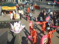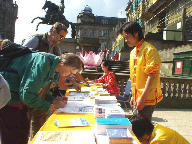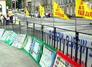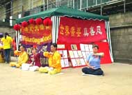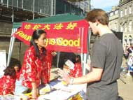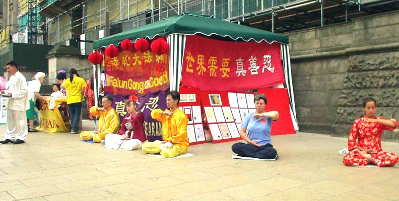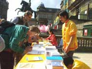 与其他来自世界各地的演出群体一样,大法弟子的演出地点选在面向交叉路口的街头一角,来自四面八方的行人游客从很远便能眺望到大法展位亮丽的色彩和围观的人群。在大法的展位,大法弟子们的节目丰富多彩,除了功法表演外,还有小弟子们合唱大法弟子创作的歌曲、扇子舞、唐装舞、飞天舞、笛子独奏等。有缘相遇的游客大都是带着一份惊喜一边观看演出,一边认真地阅读大法资料。大法传单每天都要发出两大箱,很多看了演出和传单的观众都会默默地走到我们的征签桌旁签名谴责江泽民政府对法轮大法的残酷迫害。征签桌旁常常是排着队。有人情不自禁地说:“真难以理解,中国[江泽民]政府镇压的竟是你们这样的一群美好的人。”大凡带了相机的行人到了我们的演出地点都会拍上几张,不少人喜悦地要围着大法弟子拍上好半天。大法弟子的音容笑貌携带着大法所赋予的真善忍的美好在传向世界各地,走进更多人的生活。