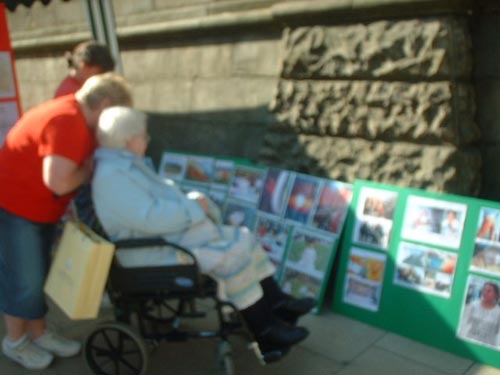 在大法弟子的演出场地同时还展放了一系列正法之路图片。大法的美好与邪恶的镇压形成了鲜明的对比,一目了然地展现在人们的面前。