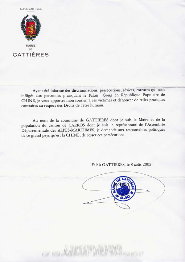 我以卡逖埃尔市--我是此市的市长--及卡罗县的百姓的名义--我是阿尔匹斯滨海省议会在这个县的代表,要求中国这样一个大国的政治领导人停止这场迫害。