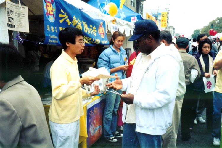 【明慧网2002年8月27日】八月二十四,二十五日正值周末。一个每年由华人主办的大型摆街会在湾区奥克兰市举行。吸引了大约十万人游览参观。湾区大法弟子和往年一样,决不轻易放过每个讲真相的好机会。这次不同的是,正好师父的经文《快讲》刚刚发表,弟子们学习着经文,怀着讲真相、救度世人的极大热忱组成不同内容的摊位。之前弟子们夜以继日地准备了大量中英文版的资料,光碟和大法弟子创作的歌曲光碟等等。