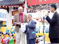 牌楼前,大法弟子搭起了简易舞台,舞台后方悬挂着大型英文横幅“庆祝法轮大法日”,舞台两侧的“法轮大法”、“真、善、忍”彩旗迎风招展。空中飞舞着硕大的彩色汽球束,更是舞台的最好装饰。在舞台的另一端,是大法资料信息台、中文书籍台、中文书法展示台及摆放着大法在世界洪传盛况和受到褒奖的大型展板。