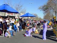 7点多钟游行结束,而当天整条街的夜市才刚刚开始。当大法弟子返回大法信息资料台时,高兴地看到更多的人们主动索取大法真相材料、主动签名,并询问炼功点详情。人们被告知,可从当地报纸上登载的消息,获取更多教功班、炼功点详情。一对夫妇带着2个孩子,告诉大法弟子他们最近正在从黄金海岸往这边搬家,他们全家人打算在附近炼功点参加学炼法轮功。