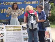 德国弟子:九月份德国最大的两个党派主席施罗德和麦克尔前后两天来库堡做公开演讲,我们决定利用这个机会向公众说明法轮功受迫害的情况。我们在准备报纸时,两位警察过来问了不少有关大法的问题;很多人要了报纸,并对大法表现出很大的兴趣;一位人权委员会的议员要我把美国议会的188号决议寄给她;一位电视台记者表示想制作一个关于我们炼功的电视片。一个炼了很长时间气功的中国人对同修说,“我等你已经等了很久很久了。”