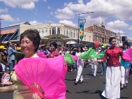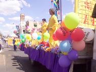 中午12点,游行队伍徐徐步入人群熙攘的市中心,法轮大法的彩车在祥和的“普度”乐曲中缓缓前行,赢得阵阵喝彩。