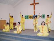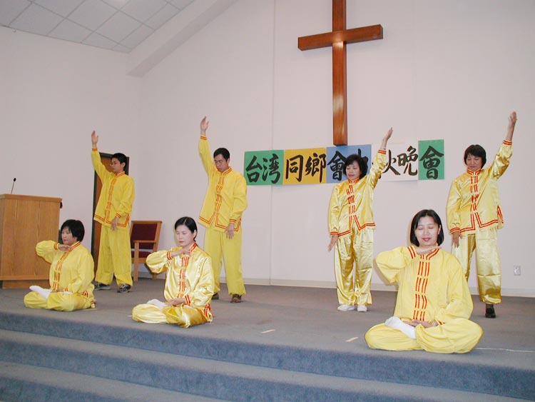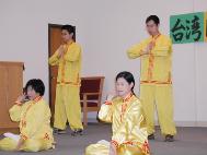 晚会上,来自达拉斯地区的台湾乡亲、留学生和各界华人共聚一堂庆中秋,气氛热烈。各个团体分别表演了唱歌、舞蹈等精彩节目,其中法轮功学员表演的法轮功功法格外瞩目。七位学员穿着整齐的炼功服,在悠扬的炼功音乐声中,在台上演示了舒缓、优美的炼功动作,美好祥和的表演引起了在场所有人的浓厚兴趣,台下闪光灯不停地闪烁。
