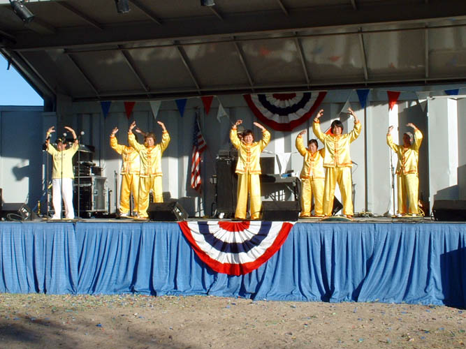 2002年9月21日,美国德克萨斯州达拉斯学员参加当地台湾同乡会举办的中秋晚会并演示法轮功功法,受到人们的欢迎。