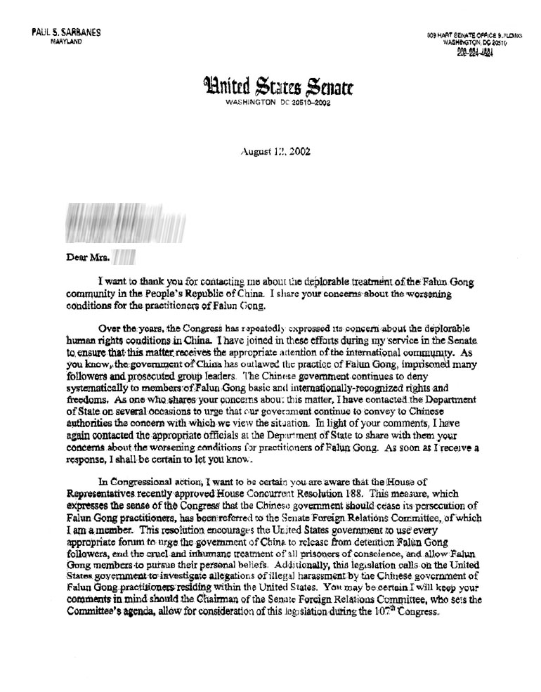 几年来,国会不断地表达了它对中国恶劣人权状况的关注。在参议院任职期间,我一直在为确保此问题受到适当的国际社会的关注而努力。正如你所知,中国(江XX)政府取缔了法轮功,许多学员遭到监禁,联络人受到迫害。中国(江XX)政府还在不断地、系统地剥夺法轮功学员基本的,并得到国际公认的权利和自由。作为一名与您有共同忧虑的人,我曾多次与国务院联系,敦促我们的政府向中国官方表达我们对此事的关注。在您的建议下,我再一次联系了国务院有关官员,向他们转达了您对法轮功学员处境不断恶化的担忧。一旦得到答复,我将尽快转告您。