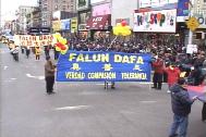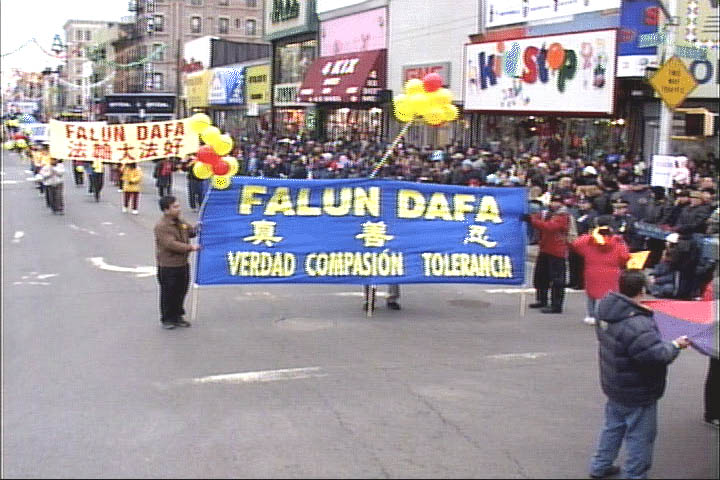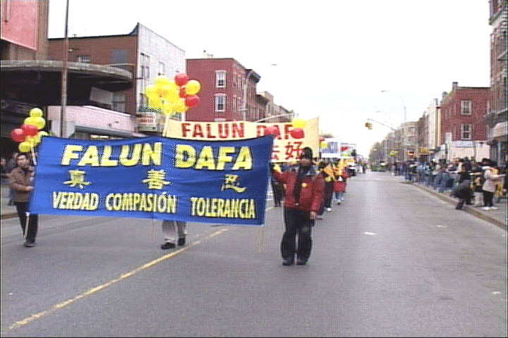 英文“法轮大法”、中文“真善忍”、西班牙文“真善忍”三种文字一体的蓝底金字的大横幅由黑人、白人、黄种人三位大法学员举着在前面开道。接下来又是大大的黄底红字横幅,英文“法轮大法”和中文“法轮大法好”,学员们带着醒目的嵌有色彩明亮的黄围巾、手执鲜艳的气球走在游行队伍中。白底蓝字的英文和西班牙文的“真善忍”大横幅最后。大法音乐悠扬。