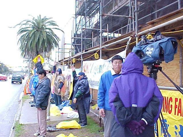 今天,风雨交加,一切活动均在雨中进行。英文39电视台采访人员现场采访学员及摄影,新唐人电视台记者也现场采访,学员通过媒体呼吁国际社会和中方有关责任单位对这些迫害事实给予重视,对案例进行严肃调查。江泽民是发起和推动这场信仰迫害运动的元凶。江泽民因群体灭绝罪在美国联邦法院被起诉,大法学员要求依法严惩血债者,要求中国停止虐杀大法学员,终止江泽民犯罪集团三年以来对大法及大法学员的迫害。