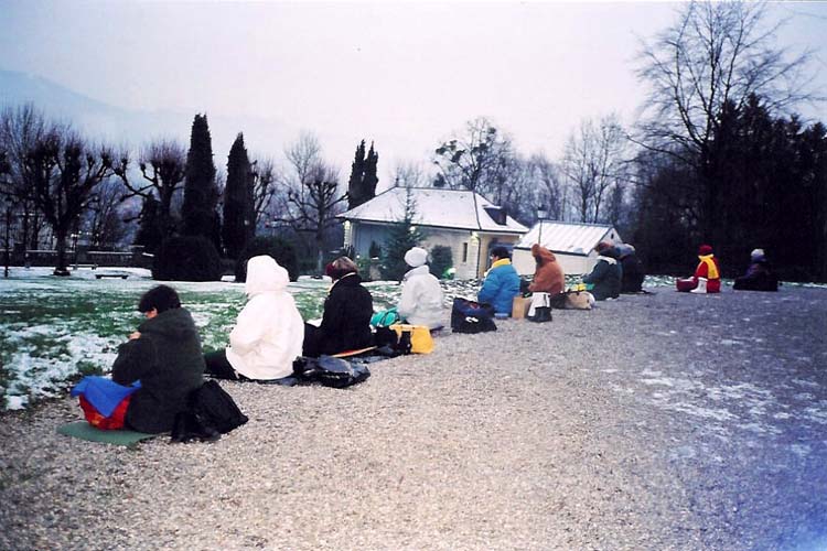 【明慧网2003年1月15日】自周日(2003年1月12日)起,瑞士法轮功学员三天来冒着风雪严寒先后分别在中国驻瑞士使、领馆及中国代表团驻地前发正念、