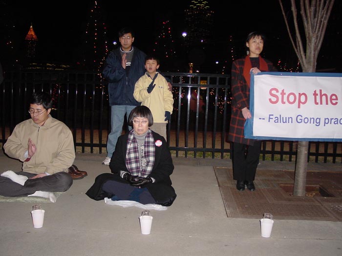 参加烛光悼念的人士中,有老人和小孩,以及曾在中国亲身遭受迫害的法轮功学员。现年33岁的吕先生,1995年在乔治亚州立大学攻读财经学位,后因不幸患上乙肝病,不得不中途辍学,修炼法轮功后,身体奇迹般地得到恢复。回国后,吕先生曾在深圳市国家税务局担任稽查科副科长。2000年,在中国当局镇压法轮功的压力下,吕先生被迫辞职,2000年11月,吕先生的新婚两个月的妻子周雪菲因在街头向公众澄清法轮功真相,被当局逮捕,非法判处三年劳教监禁。吕先生说:“我的妻子周雪菲被关押已有一年多了。在中国象我妻子这样的被迫害的人有千千万万,我们希望全世界的人来帮助这些无辜善良的民众。芝加哥联邦法院已受理了起诉江XX的案件,以‘灭绝种族罪’起诉江XX正是反映了我们千千万万炼法轮功人的心愿。”