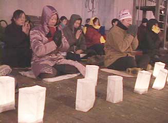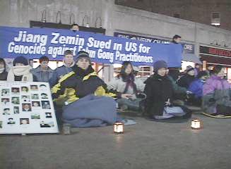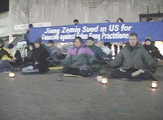 波士顿学员于1月13日冒着严寒来到了波士顿大公园炼功静坐,并打出”起诉江泽民对法轮功的灭绝种类罪”的横幅,紧急呼吁制止在中国的虐杀升级。在结束了13日上午波士顿大公园炼功静坐活动以后,法轮功学员又来到了中国城进行烛光守夜,许多法轮功学员是下班后匆匆赶来的,使参加活动的人数增加许多。