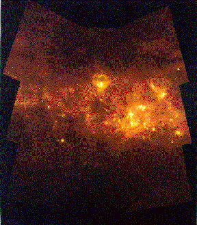 图像根据三个波段的红外线观测合成。三个波段分别为12,60和100微米。黄色到白色区域是红外线明亮区域。这些明亮区在可见光照片上不会出现。新形成的恒星总是在气体和尘埃云的纵深区域。而这些气体和尘埃云对各种光而言几乎是不透光的。新恒星放射的可见光能量被气体和尘埃云吸收掉了。但对红外线言,气体和尘埃云由于吸收了光能量而被加热从而成为红外线光源,从而新恒星可以被观测到。