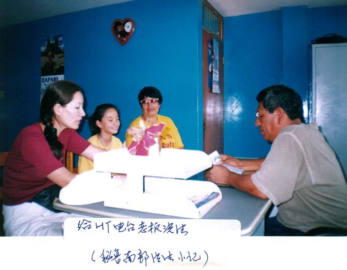 钦查(CHINCHA)是前年大法弟子步行时第一被当地电台采访的地方。之后,大法弟子多次来到这儿洪法。我们到达这儿时,已是傍晚黄昏时。中心广场的椅子坐满了人。我们顾不上去找旅店,一个不漏地发放了传单。晚上,我们为西人弟子的生日举行了一个小小的庆祝仪式。她说:“我长这么大从来没有离开家过生日,今天太有意义了。”