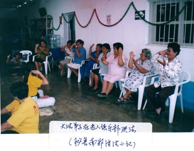 晚上,我们来到玛琉先生的家,只见他家门口站了几十个人。原来是街坊邻居借他家开小会。会议结束时,西人弟子向所有的人介绍了法轮功,向他们展示了五套功法。颇感兴趣的邻居和玛琉家人一起学功。教功结束后,玛琉先生激动地告诉我们,他实实在在感受到这个功法的美好。他姐姐捧着录音机,听着炼功音乐带不愿放开。离别时,我们留下几本西班牙语大法书籍复印本。他的家人和邻居一再地感谢我们把这么美好的功法带给他们。大法弟子心中明白是恩师给了众生这万古难遇的机缘。