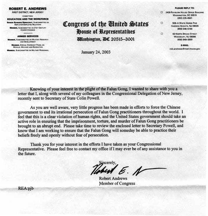 如你所知,一些迫使中国[江氏]政府停止其在全球范围内对法轮功学员的无理迫害的努力收效不大。我认为,[江氏集团对法轮功的迫害]是对人权的公然侵犯,美国政府应该发挥积极的作用,以保证[江氏集团]对法轮功学员的监禁、折磨和虐杀得以立即制止。请拨冗审阅随信附上的致国务卿鲍威尔的信,并能了解到我正在致力于确保法轮功学员有一天能不用担心受到迫害,自由、公开地信奉他们的信仰。