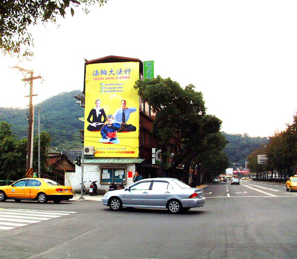位于台北外双溪的故宫博物院驰名中外,特别是来自中国的访客,参观故宫更是必到之处。最近在离故宫不远处的大马路旁,矗立了一个十分吸引人的大型看板──法轮大法好,祥和的表情自然展现出来,静静的送给路过行人美好的一天。