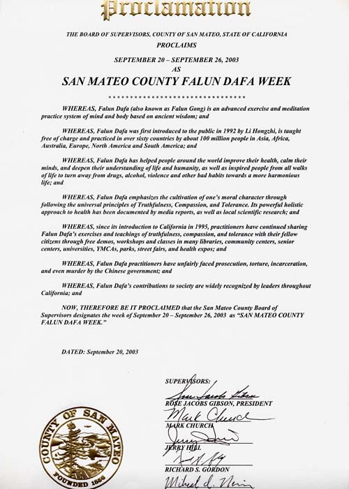 鉴此,圣马刁郡监事会褒奖2003年9月20日至26日为“圣马刁郡法轮大法周”。