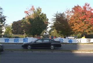 加拿大外交部是加拿大直接和中国政府沟通,敦促停止迫害法轮功的主要政府部门。几年来,是大量谎言和压力的目标。法轮功学员能在此地发正念,讲真相真是机会难得。今天,利用双边人权会谈的机会,法轮功学员不但将“法轮大法好”、“停止迫害”、“全球公审江”等信息传递给了中国人权代表,而且向加拿大的外交部的官员们展示了法轮功的美好,揭露了邪恶。学员们在一天的请愿活动中,不断向过往的外交部工作人员发资料、讲真相。许多工作人员表达了对法轮功的支持和敬佩。一位走出外交部大楼的女士接过资料后,真诚的用汉语对法轮功学员说,“谢谢你。”活动即将结束时,两名工作人员出来感谢学员们展示的巨大横幅,使办公大楼里的人都可以清楚地看到上面的字。他们说大部分人都向外观望法轮功学员练功,并立即有人上网查询有关法轮功的信息。