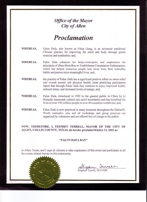鉴此,我,斯蒂芬-特雷尔(Stephen Terrell),德州考林县艾伦市市长,宣布2003年10月12日为: