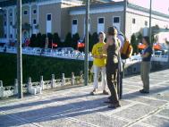 法轮功学员受邀参加罗德岛州的哥伦布日节游行,由于天气的缘故,观众人数不多,可没有一位学员介意。为准备这次游行,来自三个州的学员花了不少心血。大家齐心协力,都不受恶劣天气的影响。游行结束后,组织者开车前来告诉我们,明年一定再邀请我们,并感谢我们的动人表演。