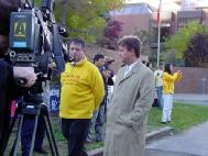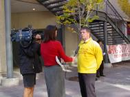 在Calgary中领馆前,法轮功学员在接受A Channel电视台主持人的采访学员与Calgary Herald记者交流学员在接受媒体CFCN TV记者的采访