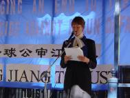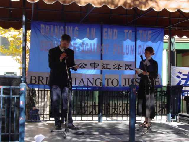 中午12:30,一场以“维护正义、良知、自由,让我们一起结束这场对法轮功的迫害”和“道义、人心法庭公审独裁者江泽民”为主题的模拟公审演出在市中心的步行街拉开了序幕。首先,议员助理James Istvanffy代表卡加利议员Rob Anders发表演讲,谴责了江泽民发动的这场对法轮功的迫害,并表示将继续支持法轮功的和平抗议。之后,部分法轮功学员在舞台前向各家媒体和行人展示功法,“模拟公审”正式开始。
