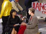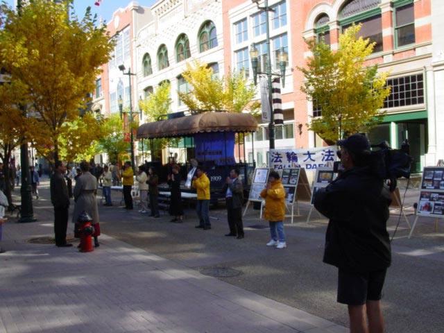 这天早上,法轮功学员们来到了卡加利的中领馆前炼功、发正念,卡加利的电视台A Channel首先来到学员中进行了采访。交谈中,大法学员与节目主持人卡特谈到了法轮功以及在中国的迫害,谈到了为什么每天坚持在中领馆前和平请愿,还谈到了只要全世界的正义人士携起手来,一定可以结束这场以谎言为基础的、强加于法轮功以及法轮功学员身上的迫害。当主持人了解到中午在市中心有一场模拟公审江泽民的演出时,他们欣然接受了法轮功学员的邀请。