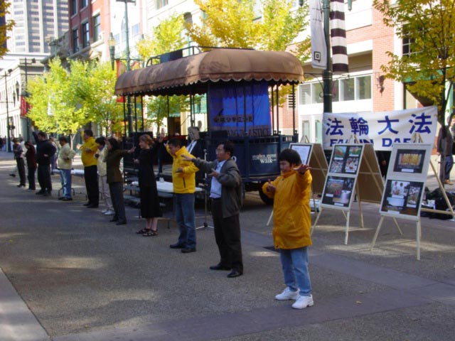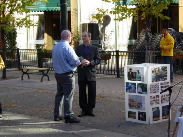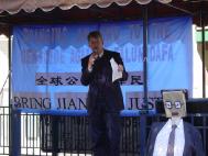 学员与立法机构成员Jon Lord交谈公审开始前,James Istvanffy助理代表议员Rob Anders发表演讲,谴责江泽民对法轮功的迫害公审开始前,部分学员作功法演示