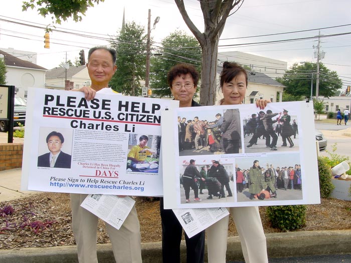 在市中心的公园,我们架起了展板。当地的报纸DAILY CITIZEN 和电视台WDNN采访了我们的新闻发布会。他们详细了解了美国公民李祥春在中国受迫害的情况。亚特兰大市法轮功学员吕朝晖先生向记者们讲述了他的妻子被关押在劳教所近3年以及遭受折磨的情况。
