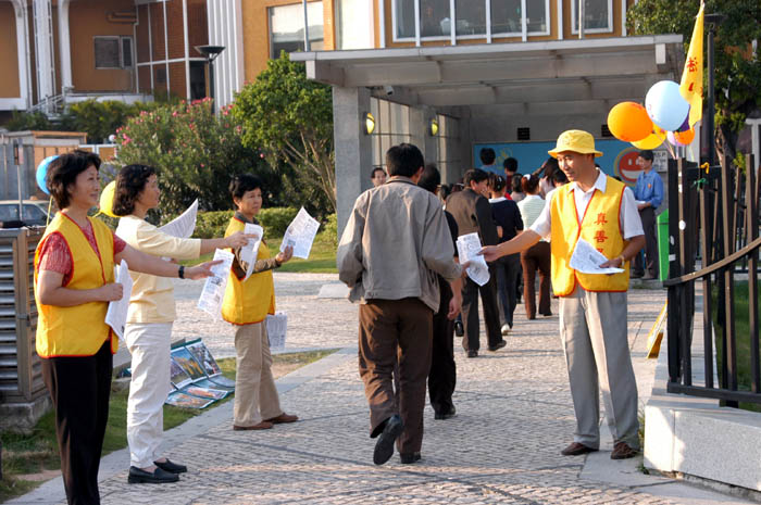 【明慧网2003年10月20日】10月17日,江氏犯罪集团的“骨干”成员曾庆红以国家副主席的身份来到澳门出席某签署仪式。由于曾庆红的到来,澳门大量警察、便衣又是监视又是封路。虽然环境艰难、压力重重,但是澳门学员正信正行,以学法炼功、发正念、讲真象的和平行动,抗议江氏犯罪集团对法轮功的血腥镇压
