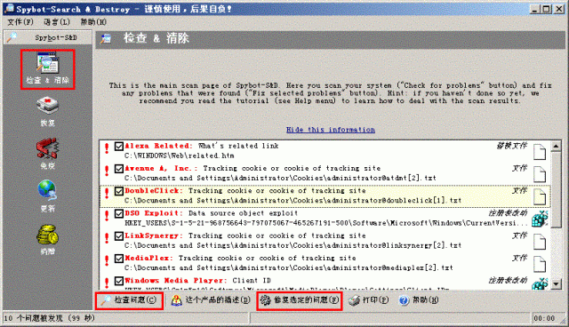 对于潜伏的间谍软件,用SpyBot这样的探测器检测比较有效。(但是仍然不能保证全部都能够监测得到)另外SpyBot还可以检测到系统的一些漏洞并可以进行补救。