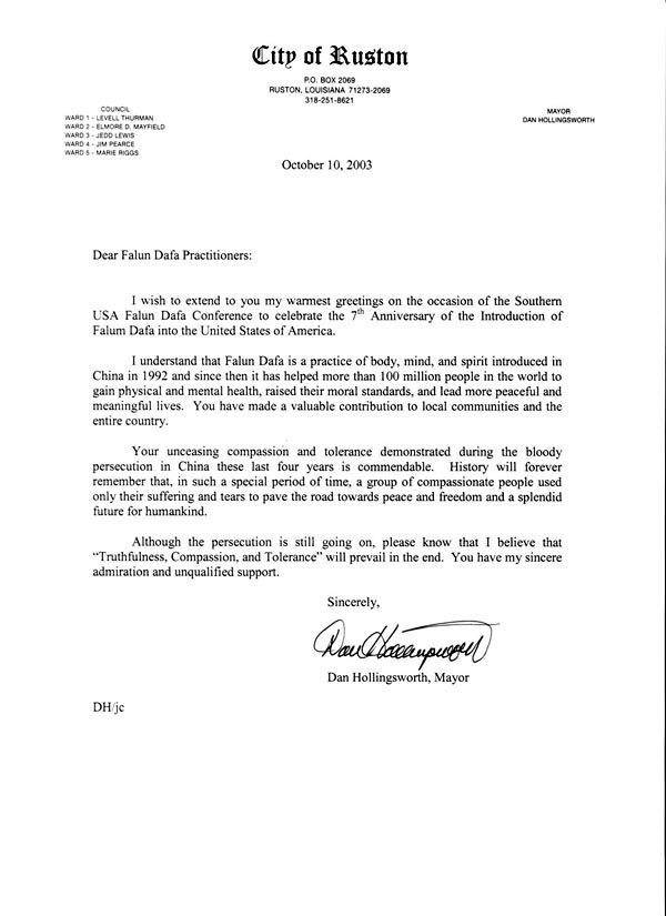 豪林斯沃思市长在信中说,我知道法轮大法是一门性命双修的功法,于1992年在中国传出,并自此使全世界上亿人身心受益、道德回升,从而使生活更加祥和,更有意义。你们对当地社区及整个国家做出了有价值的贡献。