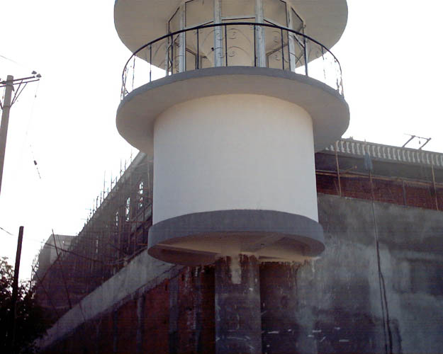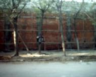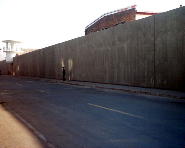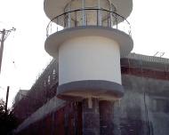 | 已经基本建成的看守塔楼 | 监狱围墙外正在巡逻的武警 | 刚刚完工的高达6米的监狱围墙 |
