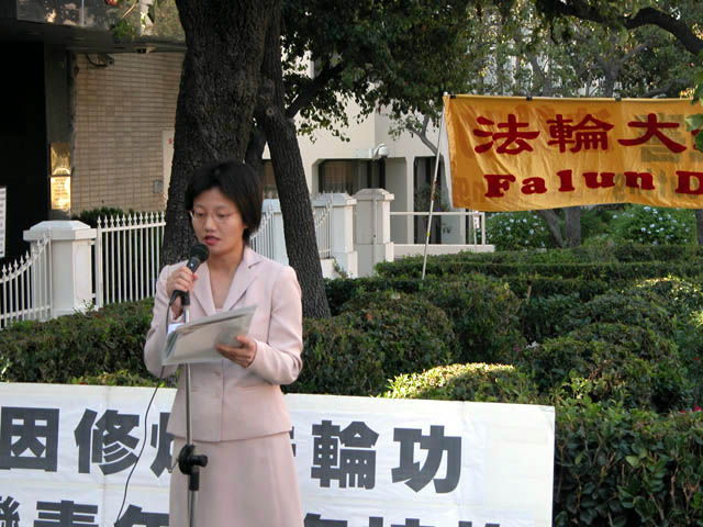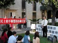 【明慧网2003年10月29日】10月25日星期六,洛杉矶法轮功学员在中国领事馆前举行新闻发布会,呼吁立即无条件释放赴上海观光访友却遭秘密拘禁的台湾法轮功学员林晓凯。台湾侨务委员与全侨民主和平联盟洛杉矶支盟成员也到场声援。林晓凯被秘密拘禁一事已经引起台湾各大媒体,朝野以及海外的共同关注。