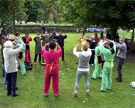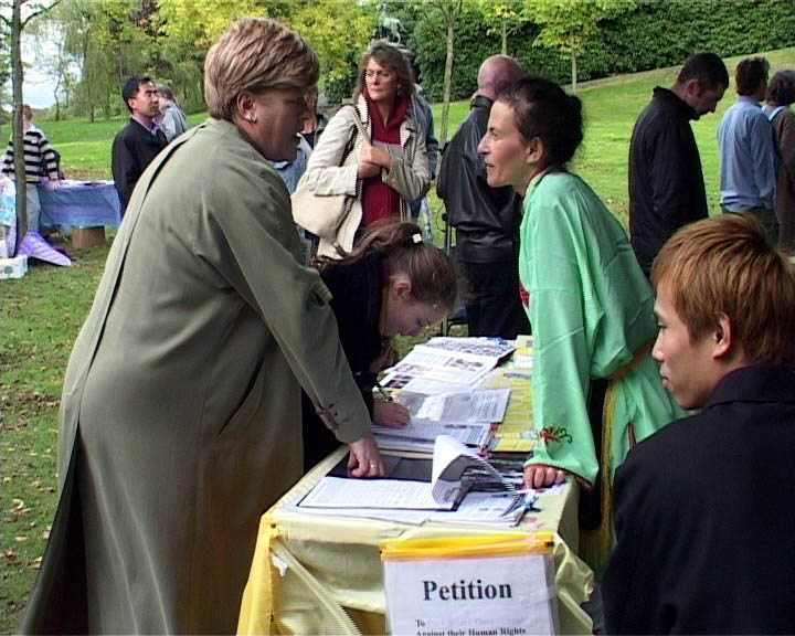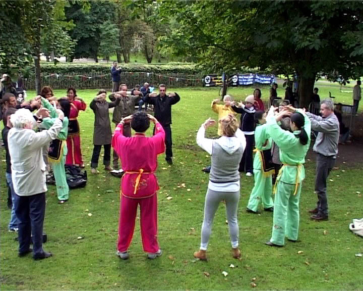 【明慧网2003年10月3日】9月29日是精神援助组织在哥拉斯哥举办的和平节表演的最后一天。虽然天气时雨时晴,我们的功法演示和扇子舞表演仍然吸引了很多人。演出结束后,我们在旁边的草坪上就地义务教功,很多人加入了学功的行列。
