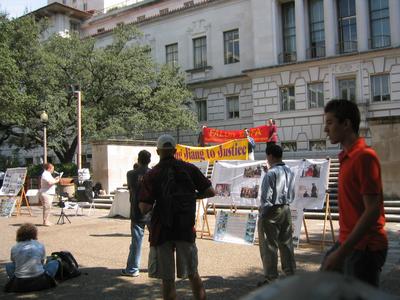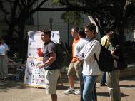 中午12 点,圣安东尼奥和奥斯汀的法轮大法学员在德州大学拉开了“法轮大法”及“审判江泽民”的横幅,并发正念清除邪恶干扰,然后学员在开场白中陈述了江泽民无视宪法和人权,公然调用了一切的党、政、国家机器对修炼真、善、忍的法轮功学员的进行了四年的残酷镇压,造成数以万计的无辜中国百姓被抓,被打,关入精神病院,送入劳改营,无数家庭被毁,妻离子散。而此一迫害也波及了奥斯汀及圣安东尼奥的市民。