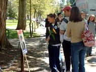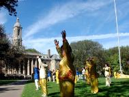 | 来往学生纷纷接过法轮功真相材料 | 法轮功学员在宾州州立大学校园炼功 |