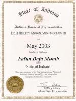印第安纳州印第安纳众议院在此郑重宣布2003年5月为印第安纳州法轮大法月作为第113届印第安纳州议会成员,我荣幸地表彰此一特殊时刻。