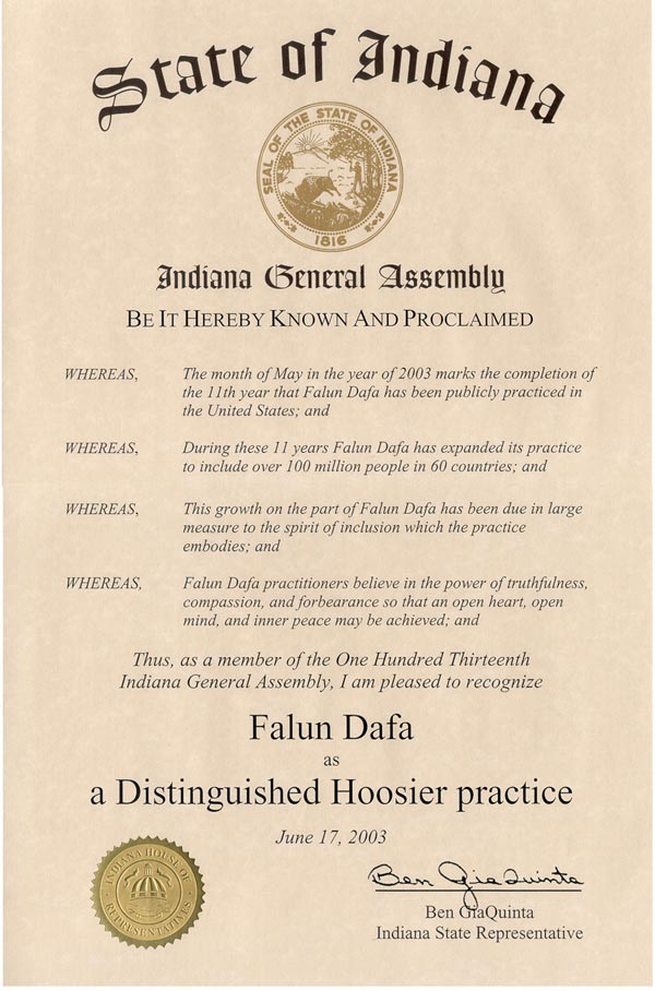 因此,作为第113届印第安纳州议会成员,我高兴地表彰法轮大法这一杰出的修炼方法。