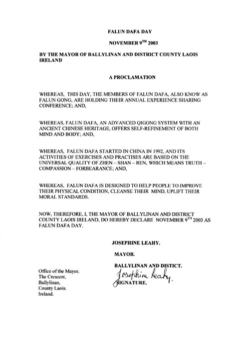 因此,我,爱尔兰劳易斯(Laois)郡巴利来南(Ballylinan)市市长,宣布2003年11月9日为