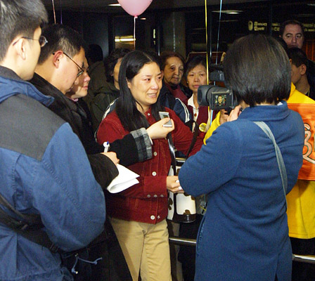 | 广州服装设计师李明,三年前因躲避迫害只身逃离中国来到纽约 | 2003年11月8日豆豆终于从大陆飞到纽约与母亲团圆 | 机场的其他旅客在了解法轮功 |