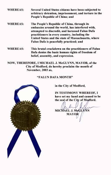 鉴此,我,梅得福市市长迈克尔-麦可格林(Michael J. McGlynn)在此郑重宣布2003年11月为本市的