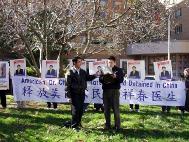 11月14日中午,居住在华盛顿地区的法轮功学员在中国驻美大使馆前举行新闻发布会,呼吁营救美国公民李祥春。